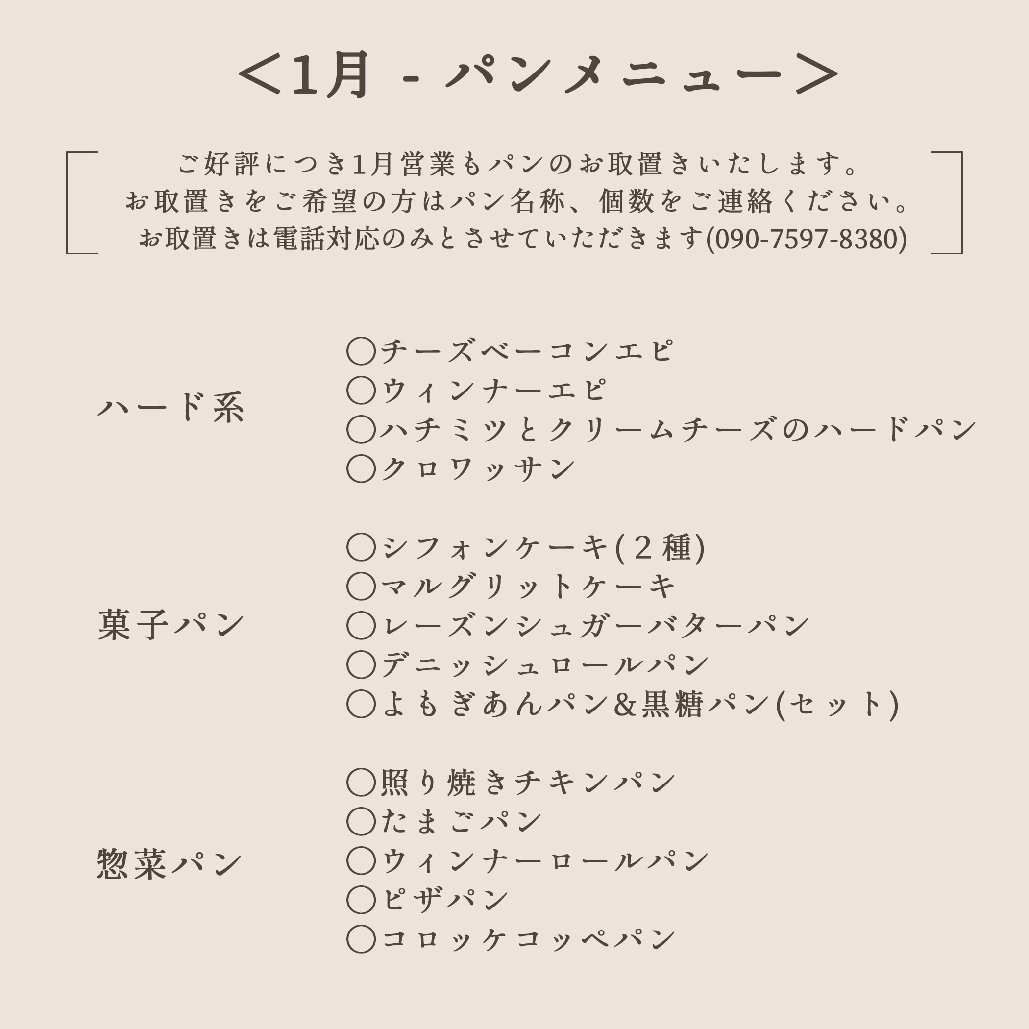 1月は営業日(毎週火曜、金曜 10-18時営業)のパンのお取置き販売もしております。お取置きのご連絡はお電話<090-7597-8380>のみの対応とさせていただきますので、お電話でパンの種類と個数をご連絡ください。※お取置きのキャンセルはお受けしておりません。万が一当日ご来店が難しい場合は必ずご連絡をお願いいたします。パン、シフォンは当日中にお召し上がりください。